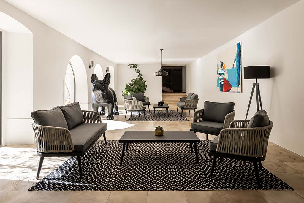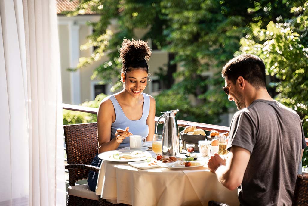 Die ersten Sonnenstrahlen des Tages lassen sich dank großer Glasfront und Balkon in diesem Zimmer besonders gut genießen. Das Zimmer ist aufgeteilt in einen gemütlichen Wohnbereich und ein Schlafzimmer mit Doppelbett.